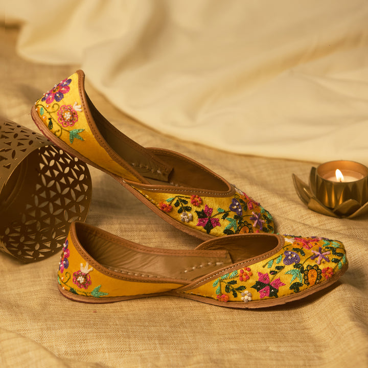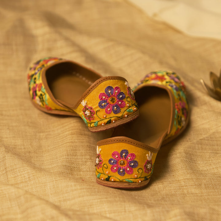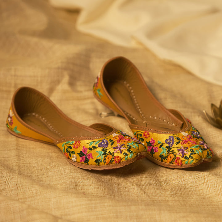 Basant jutti can instantly uplift any look. Set on a rich mustard yellow base, this jutti is adorned with vibrant floral embroidery in shades of pink, purple, orange, green and white. Each flower has intricated threadwork and delicate bead embellishments, giving it lively and textured appeal. The design is balanced with fine detailing on the front and back, making it equally elegant from every angle.