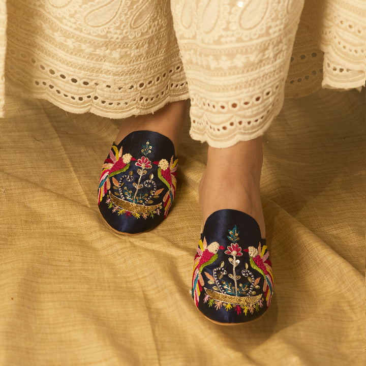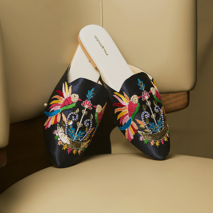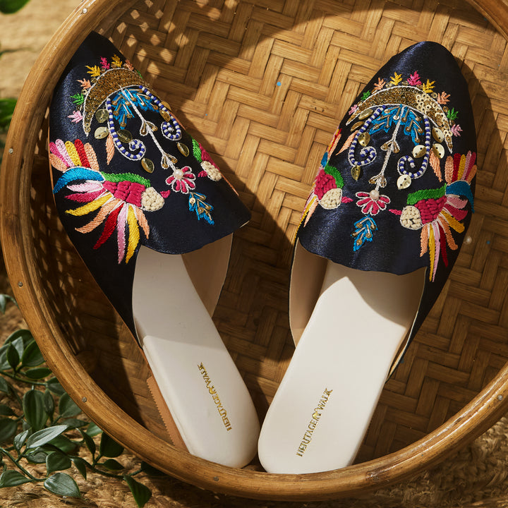 A beautiful handcrafted flat mules open from back, depicts the story of true love. How a love sparks emotions and gives colorful wings to fly high and conquer the world. The intricate and colorful threadwork is paired with the high quality bead work and sequins. Perfect to make a bold statement. This pair is a blend of traditional detail and modern sophistication.