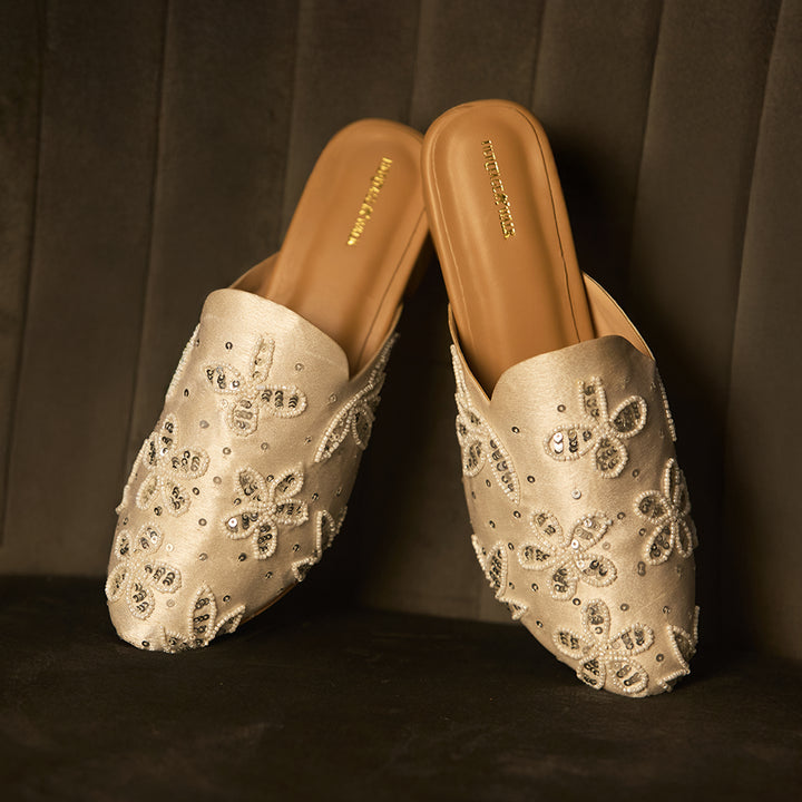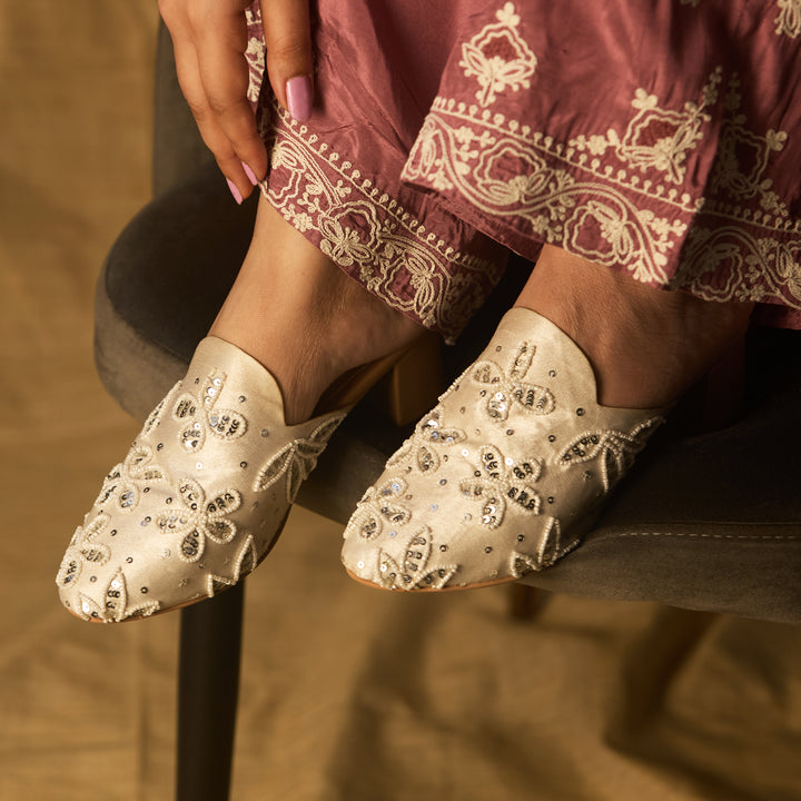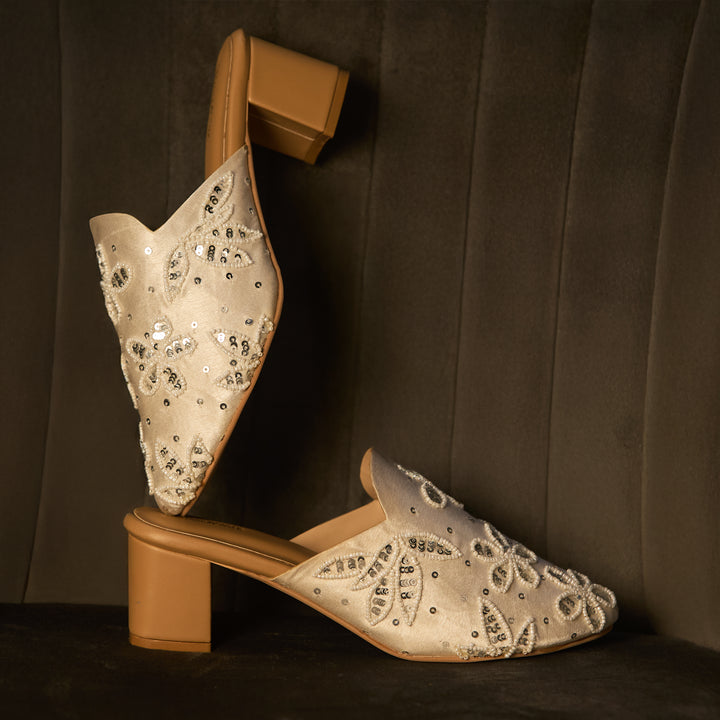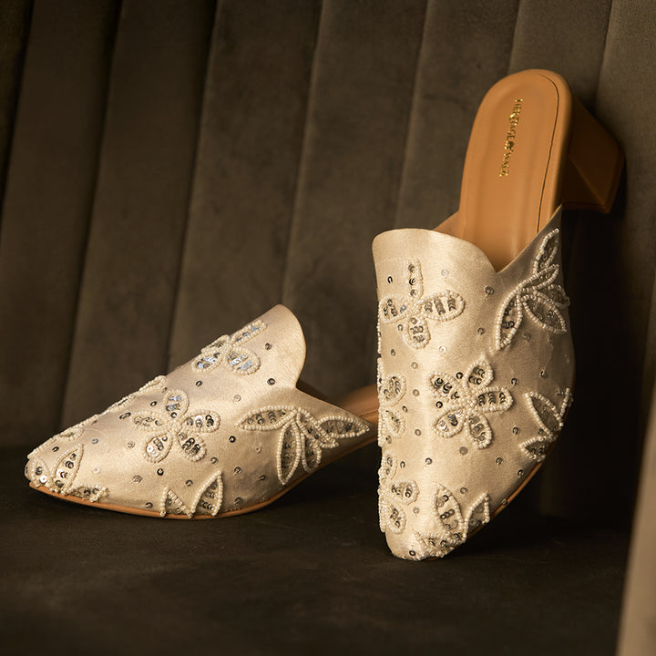 The highlight? Delicate floral motifs hand-embroidered with lustrous pearls and filled with shimmering sequins, creating a gentle sparkle with every step. Whether it’s a special occasion or a stylish everyday look, these mules add a touch of refined beauty to any outfit. Crafted for comfort and ease, the slip-on design and cushioned sole ensure you’ll not only look stunning—but feel it too. Grace meets glamour in our Ivory Bloom Heeled Mules.