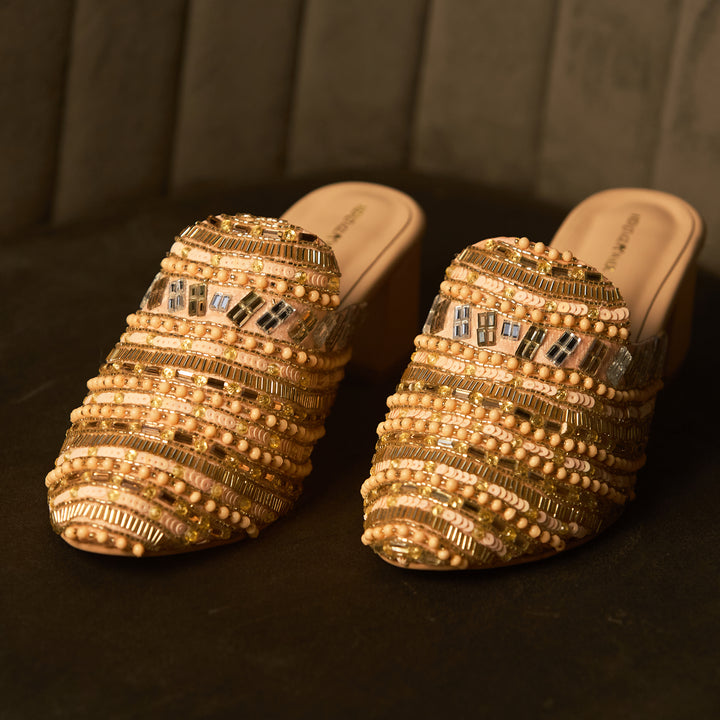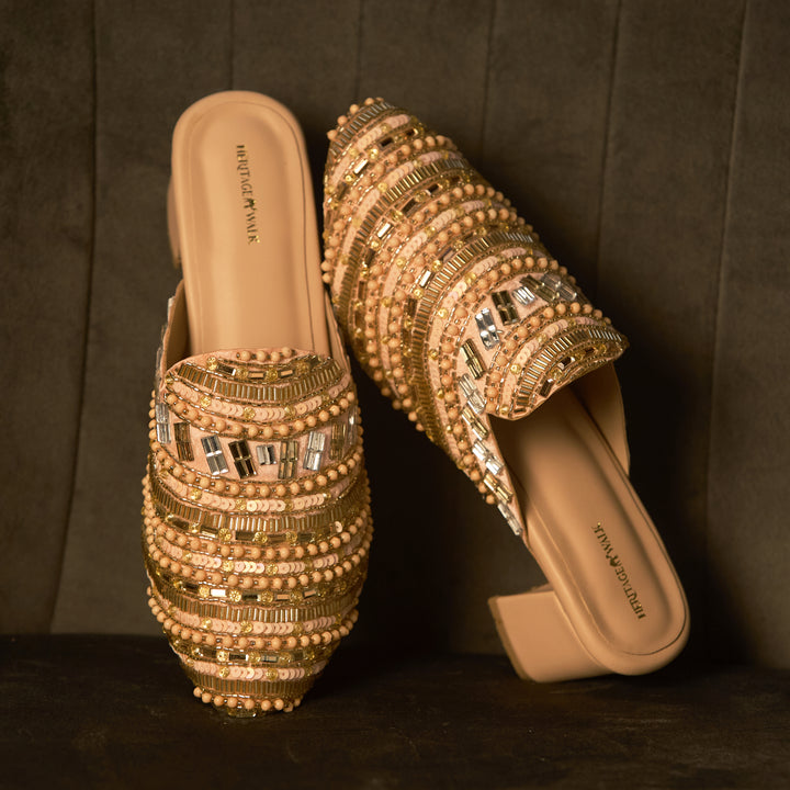 Add a touch of soft sophistication to your wardrobe with our Peachy Affair Heeled Mules. Designed in a dreamy peach hue, these 2-inch heels are delicately adorned with hand-embroidered embellishments, featuring a stunning mix of beads, sequins, and pearls. Every detail is thoughtfully placed by skilled artisans, creating a sparkling surface that catches the light with every step. The design exudes understated luxury—perfect for everything from festive gatherings to elegant evenings out. With a comfortable block heel and easy slip-on style, these mules bring together beauty and wearability in perfect harmony.