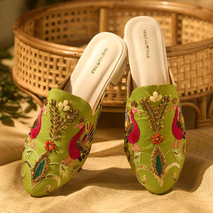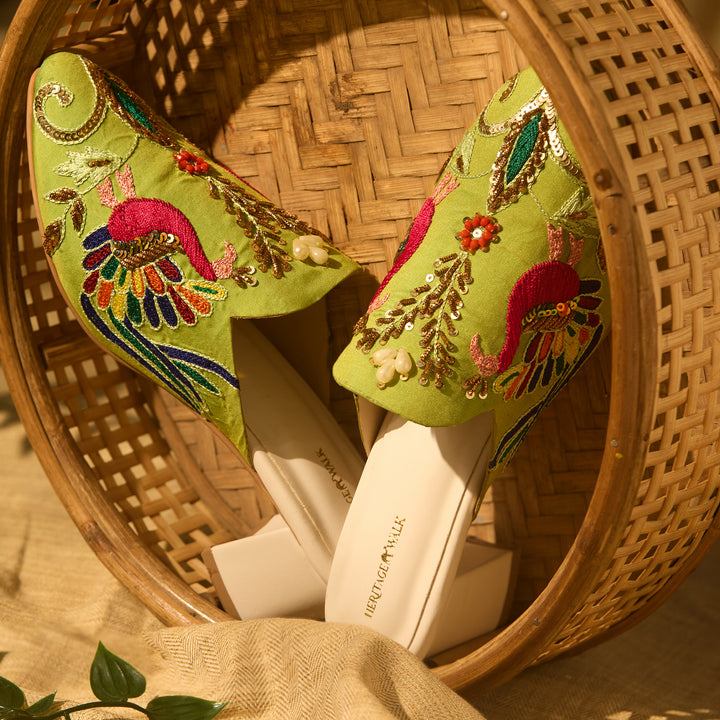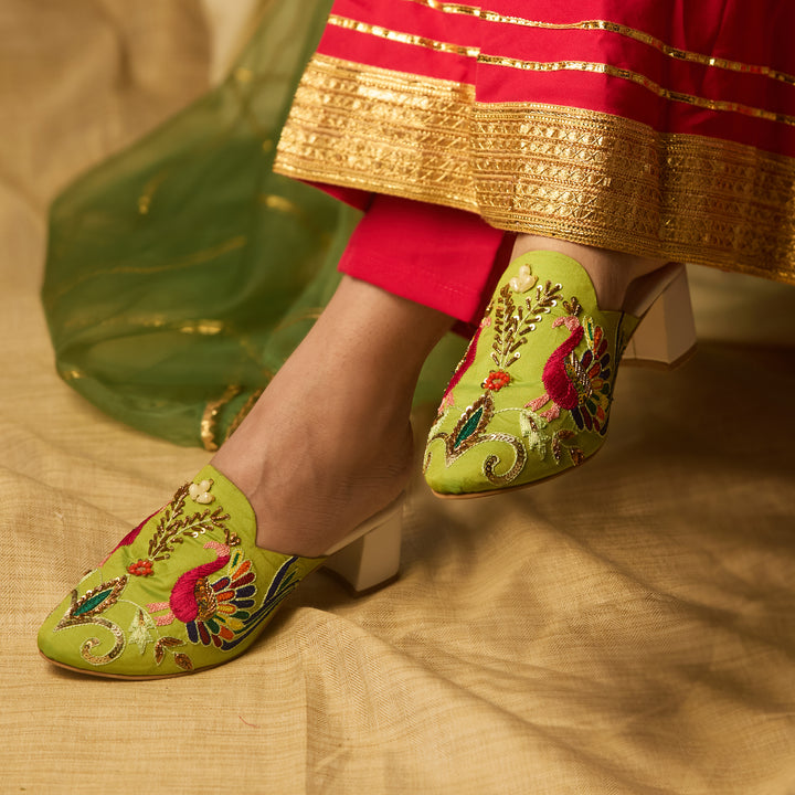 Each pair celebrates the elegance and majesty of the peacock—India’s national bird and a timeless symbol of beauty and grace. Set against a rich green base, these 2-inch heels are adorned with vibrant hand-embroidered peacock motifs, brought to life through intricate, colorful thread work. The artisanal embroidery pops with vivid hues, making these mules a true standout piece in any wardrobe. Designed for both style and comfort, the block heel offers gentle elevation while the slip-on silhouette ensures effortless wear from day to night.