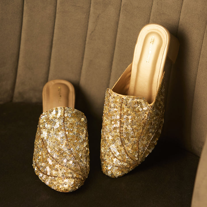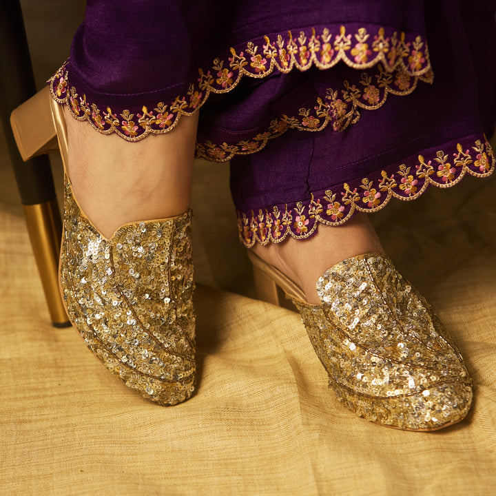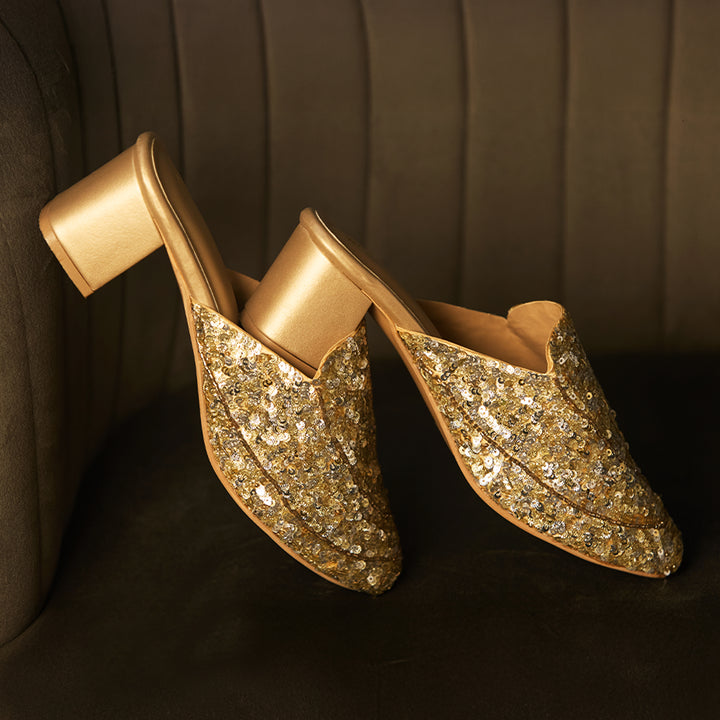 These mules are a vision of pure gold opulence; hand embroidered with dazzling combination of silver and gold sequins and metallic thread that catches every glimmer of light. Crafted from premium materials, it offers both durability and comfort for all day long. Designed with a sturdy block heel in a soft gold tone, these mules ensure balance and comfort while giving you the perfect lift. The closed front silhouette makes them versatile to create statement fusion outfits.