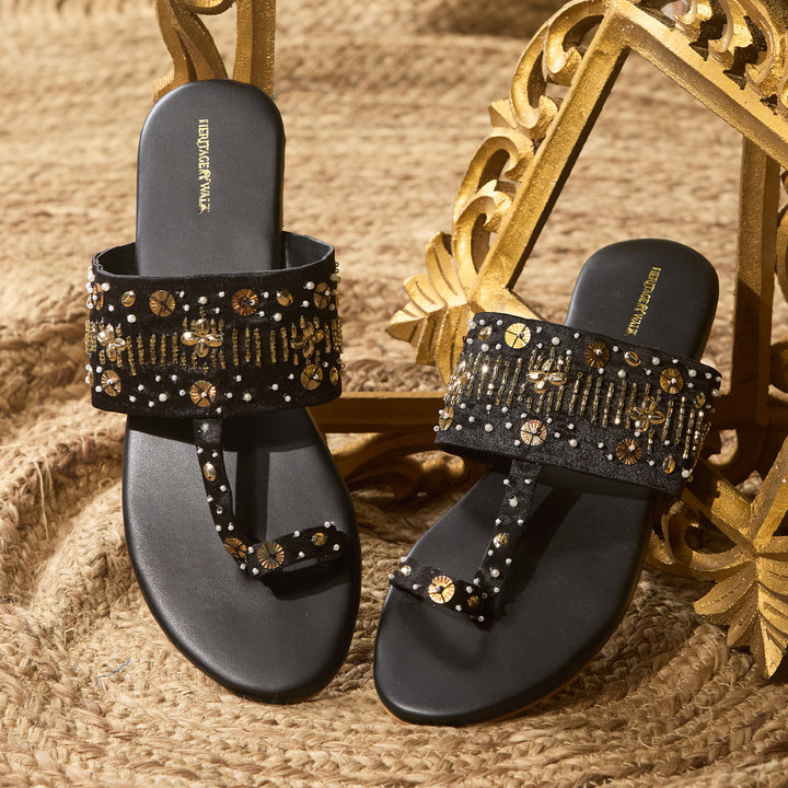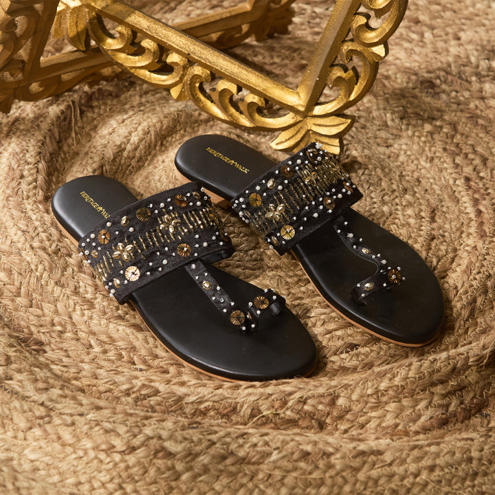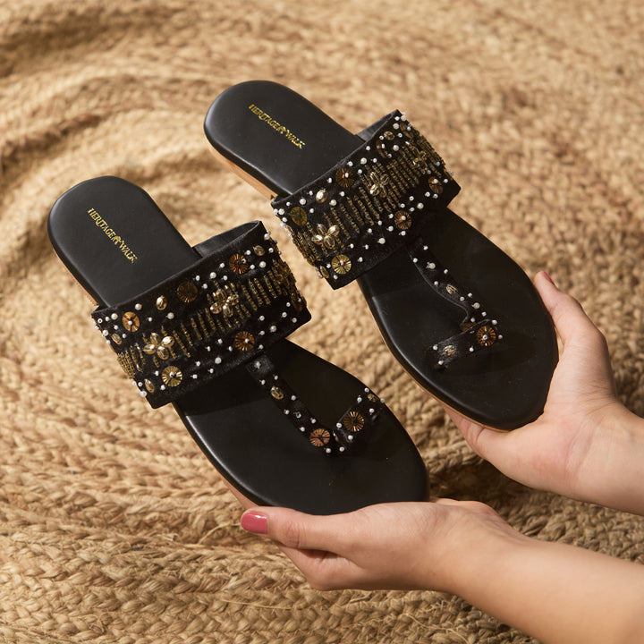 Step into timeless elegance with these handcrafted black kolha flats, adorned with golden embellishments. These flats feature delicate detailing of sequins, beads and mettalic accents that add a regal touch. Perfect for festive occasions, weddings, or elevating everyday outfits. The sleek black base beautifully highlights the golden handwork, making them a must have statement piece in your footwear collection.