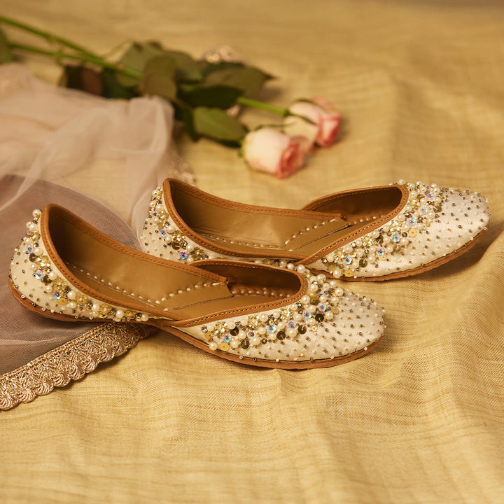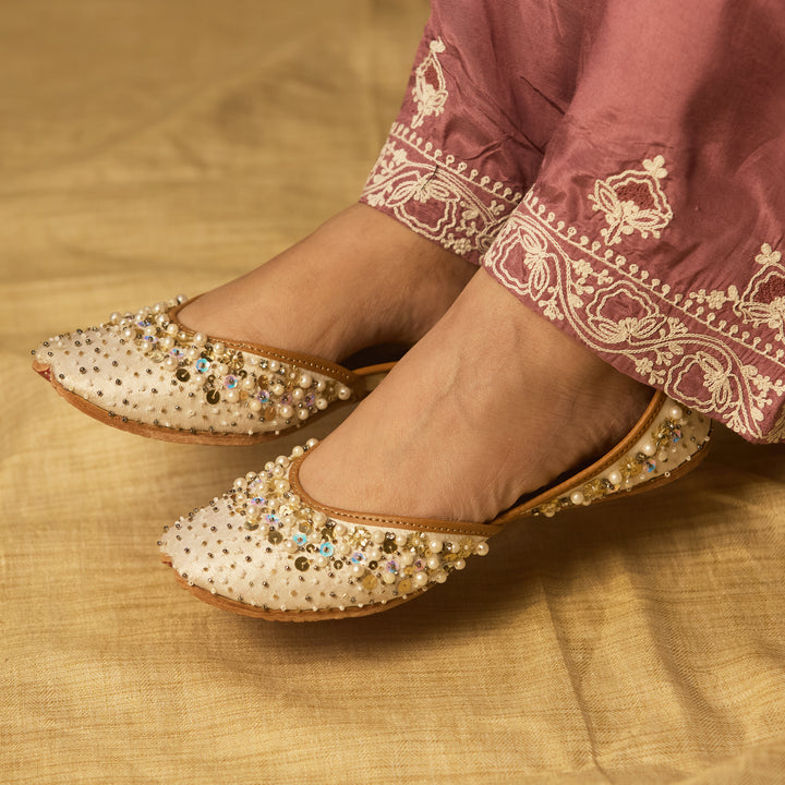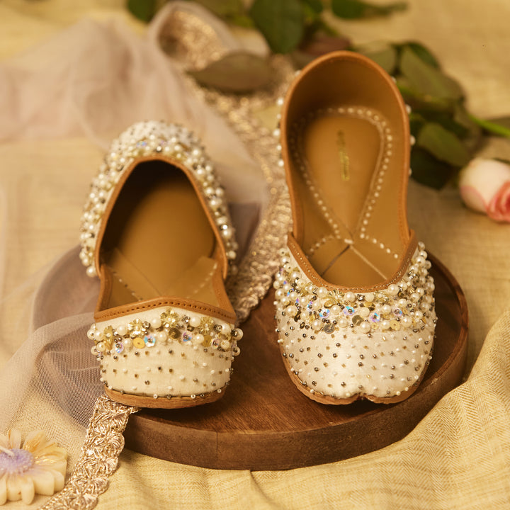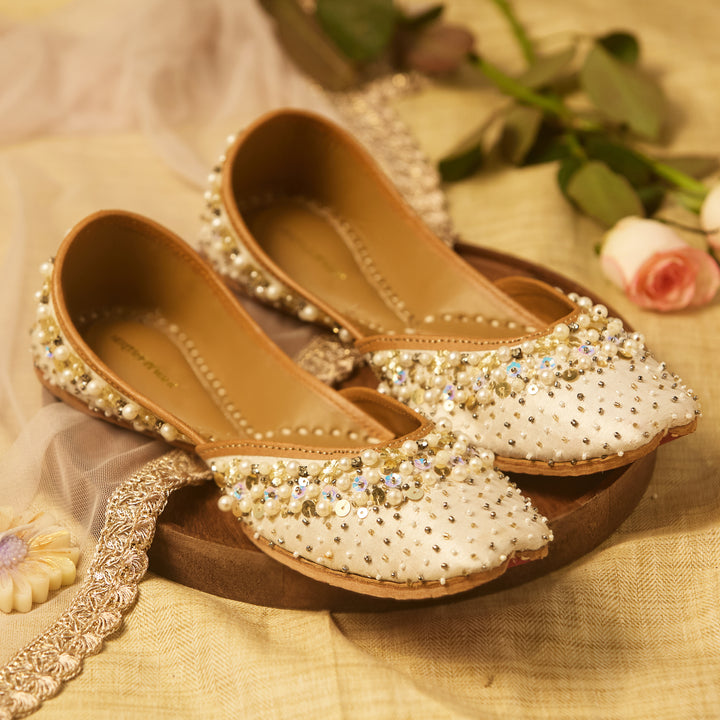 Introducing Shanaya our head turner, stunningly elegant pair of white juttis is definition of ‘subtle glam’. The luminous white base is adorned with pearls, flowers, beads like stars scattered across a midnight sky. It can elevate any outfit and make it a showstopper. This handcrafted beauty will definitely be your favorite pick for all your celebrations!