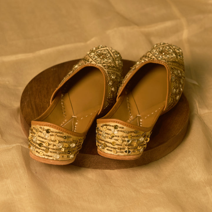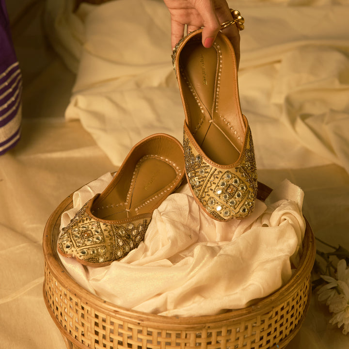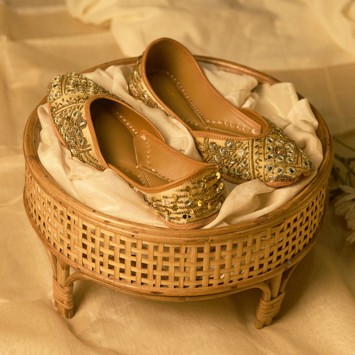 Embroidered on a rich silk base, this jutti is hand- adorned with mirrors, beads and pipework. Handcrafted to perfection! Mirror work and golden embellishments that shine with every step. Let your feet do the talking. Equal parts romantic and glamourous, this pair is a stunning choice to style with any colored outfit making it a versatile pick for any celebration.