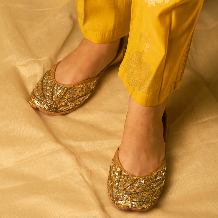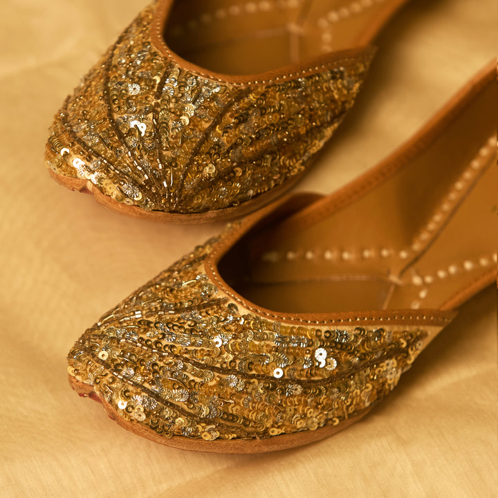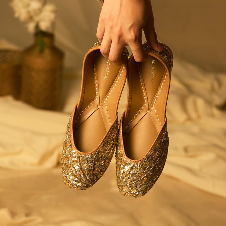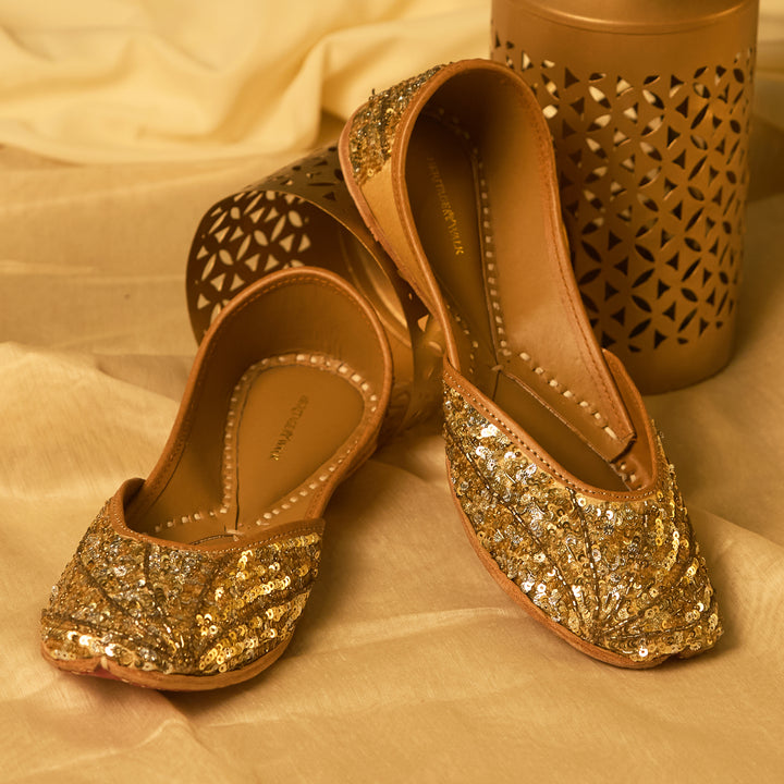 This jutti is a vision of pure gold opulence, hand embroidered with dazzling combination of silver and gold sequins and metallic thread that catches every glimmer of light. Crafted from premium materials, it offers both durability and comfort for all day long. Its rich cultural heritage, perfect for weddings, soirees or festive evenings.